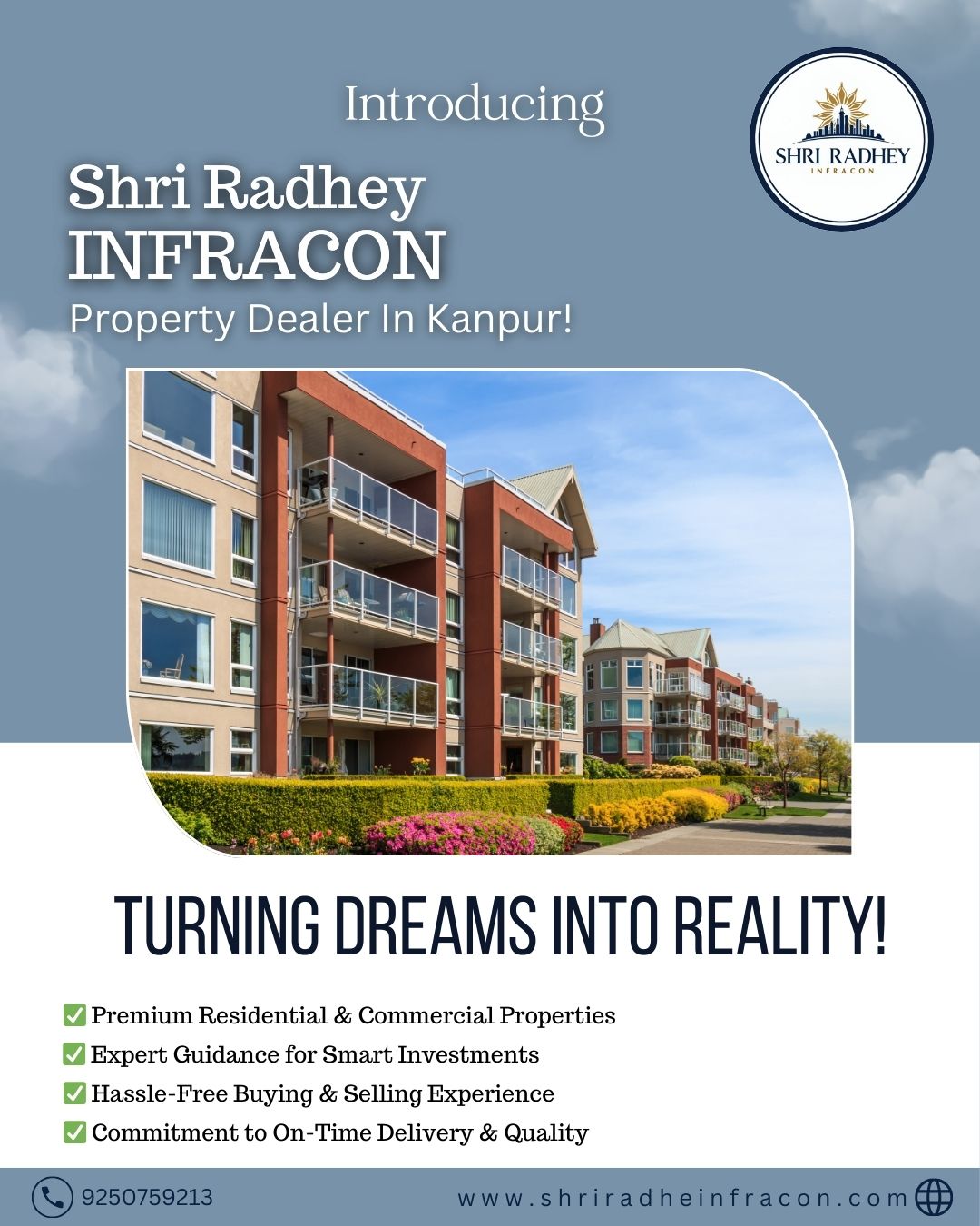 Shri Radhey Infracon is Kanpur’s leading property dealer and real estate expert, offering end-to-end solutions for residential, commercial, and industrial properties. With a commitment to transparency, trust, and customer satisfaction, we provide seamless property buying, selling, and renting services. Whether you’re looking for luxury apartments, affordable housing, or prime commercial spaces, Shri Radhey Infracon is your one-stop destination for all real estate needs in Kanpur.