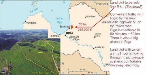 Land plot with terrain, a small river is flowing through it, picturesque scenery, comfortable driveway, electroline, Sea 9 km (Saulkrasti – the second biggest Latvian health resort) and Sigulda – also a big resort. Total area 33 ha, it is possible to separate it into smaller pieces. 0,43 EUR/m2, 4303 EUR/ha Forest 2,5 ha is unchopped. Total price 142000 EUR (price is valid only till 29.10.2009). To be used for industrial building, for private farming, for cattle breeding etc. Ecologically clean surrounding. In the neighbourhood is inhabited infrastructute. Convenient traffic with Riga: 1) By the new Baltic highroad (international class road). Nearby is Birinu castle; 2) By Pskov road. Riga and airport is reachable in 50 minutes ~ 60 km. Accommodation with foundation and 100-year old oaks (2 m in diameter). House – renewable log building or to be built a new. Perspective region, a good investment. E-mail: info@landpro.eu
